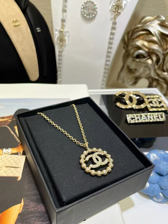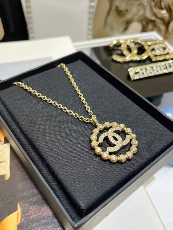 Chanel gold full diamond double C hollow round necklace-3748